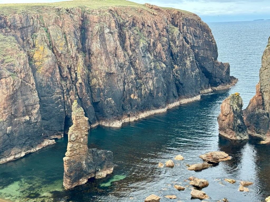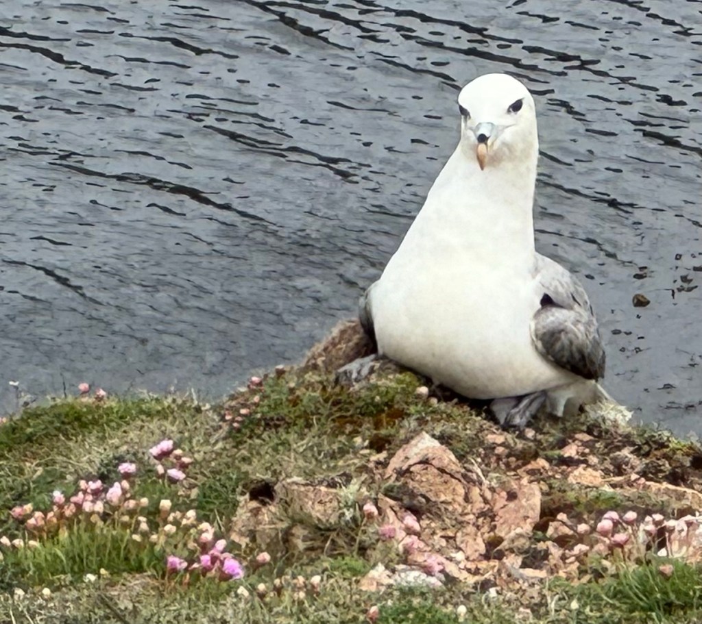 Reluctantly leaving the orcas (who hung around the area for the rest of the day) we sailed around some fabulous cliffs, the Bressay Lighthouse and watched a great skua (called a “bonxie” in Shetland-ese) fend off a gannet for a fish.
