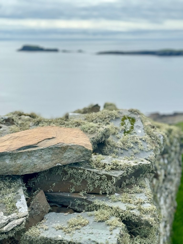 Many of the moss-capped headstones in the kirkyard have been tagged by authorities as having “failed a regulatory test” to the point where visitors are warned against even approaching them because I guess they might slooowly tip over? This strikes me as somewhat hilarious after navigating the Mousa broch steps yesterday. The headstones look pretty solid to me and this one’s hairdo brings to mind four particular lads from Liverpool.