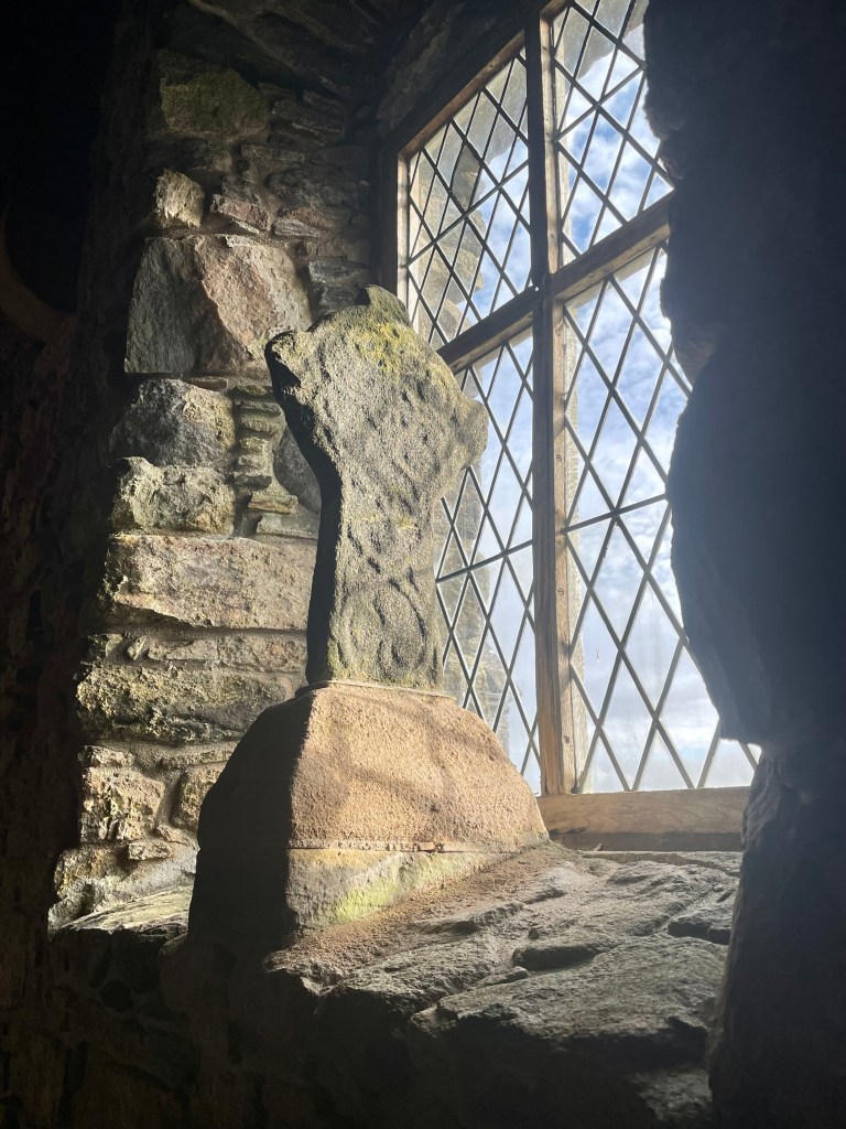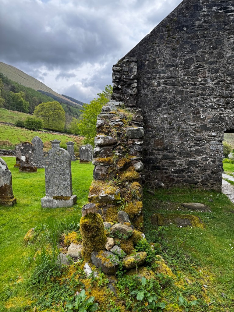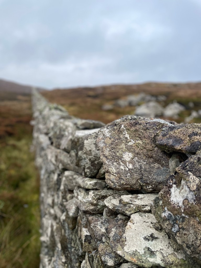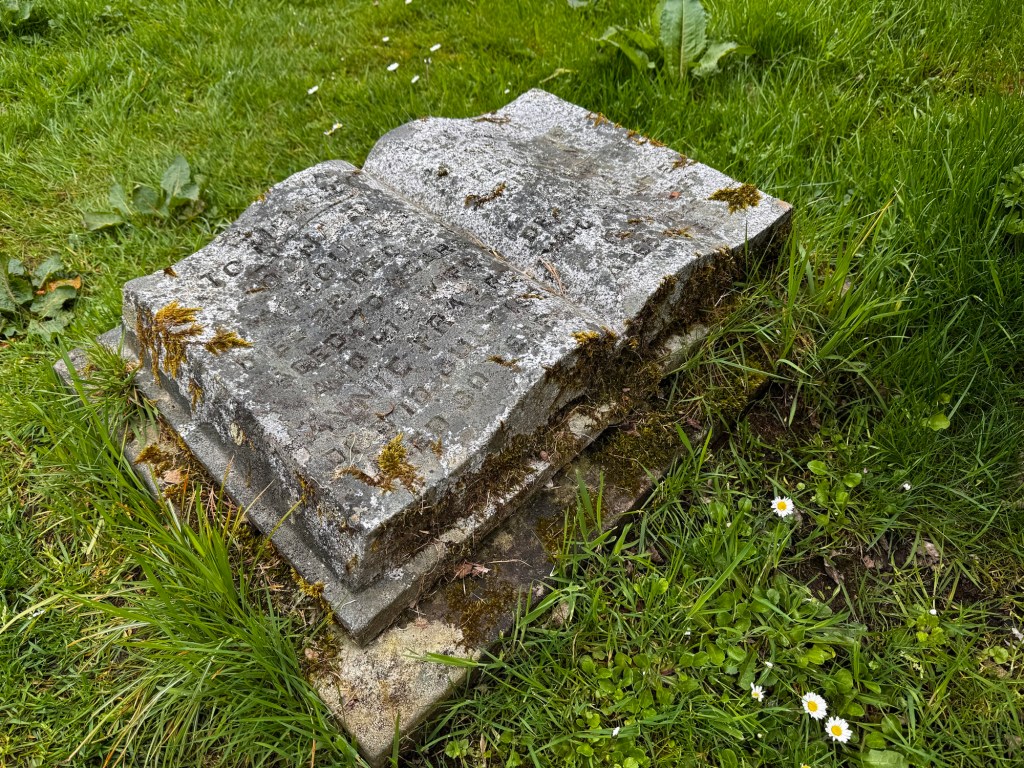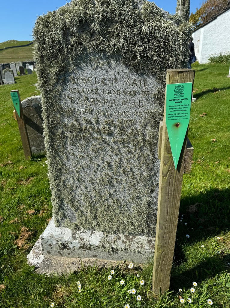 Many of the moss-capped headstones in the kirkyard have been tagged by authorities as having “failed a regulatory test” to the point where visitors are warned against even approaching them because I guess they might slooowly tip over? This strikes me as somewhat hilarious after navigating the Mousa broch steps yesterday. The headstones look pretty solid to me and this one’s hairdo brings to mind four particular lads from Liverpool.