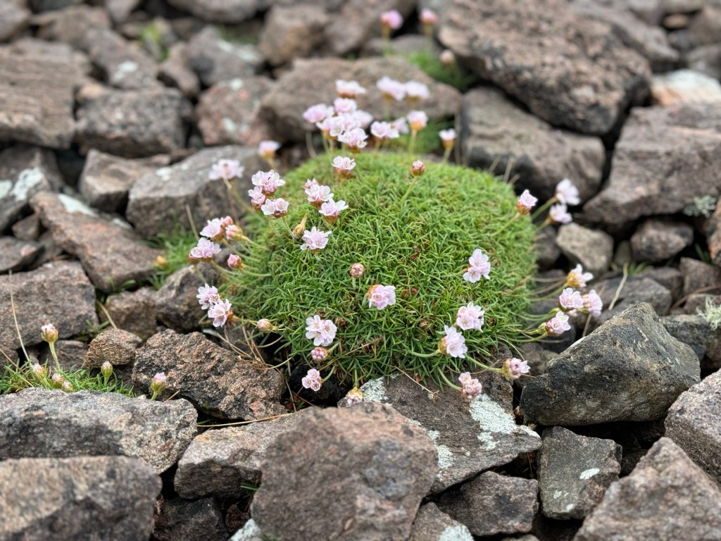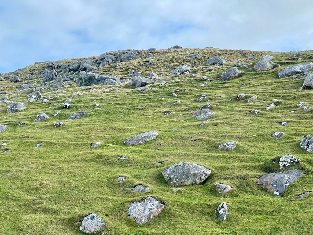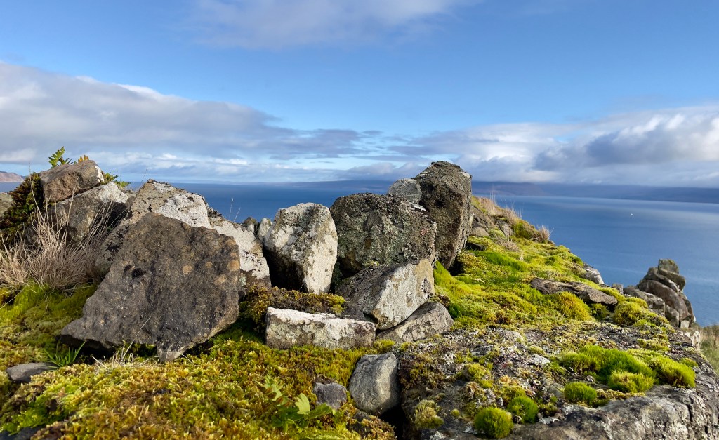 We came across a storm beach composed largely of giant boulders which had been tossed onshore by violent wind and waves over the years. Hard to imagine on this lovely calm day.