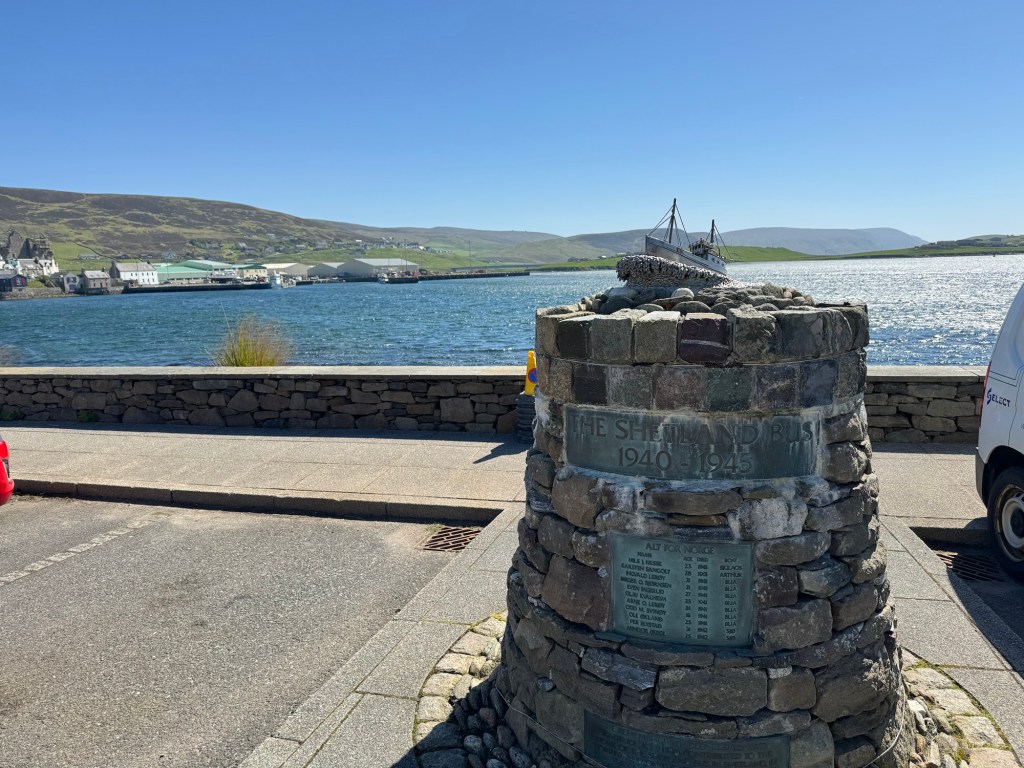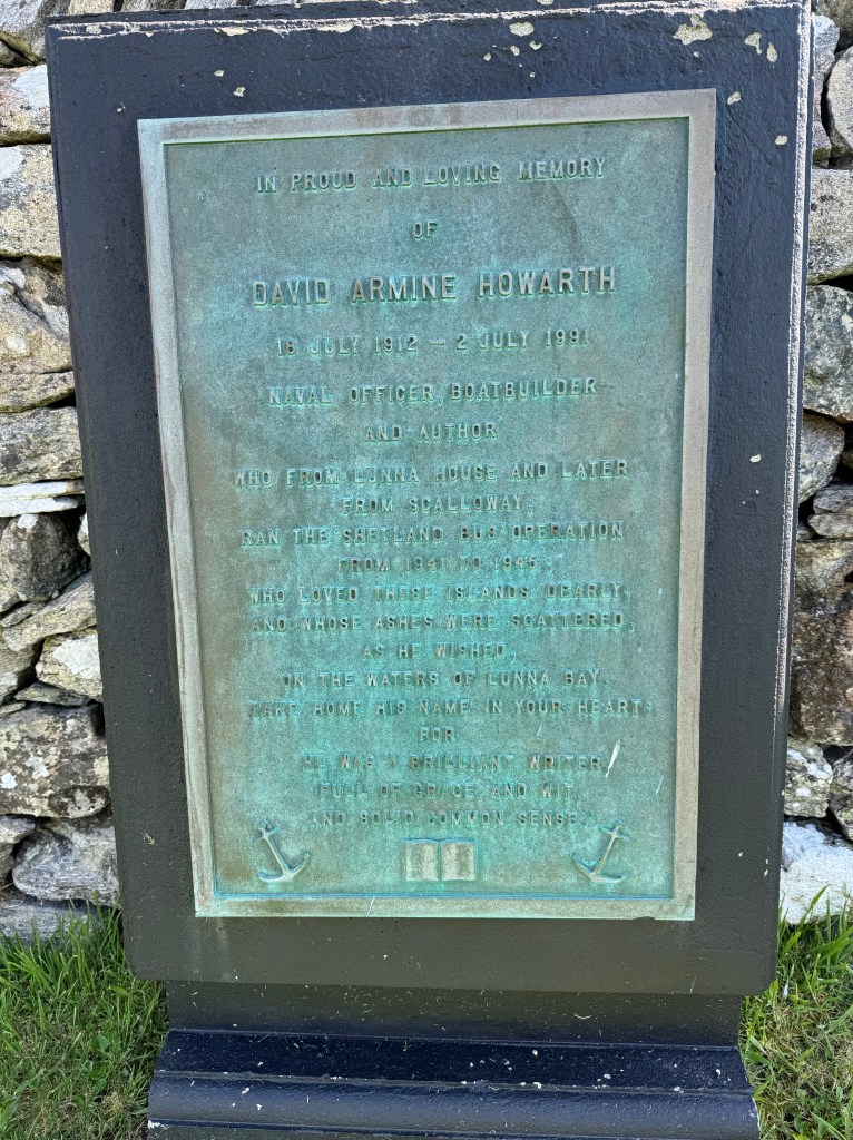 Operations were moved to Scalloway in 1942 (see previous entry), but this is where it all started. As often happened, the stones for the original Lunna House were pilfered from a nearby Iron Age Broch which is one of the reasons why so many broch ruins around the isles are quite a bit shorter than they might otherwise be. Lunna House base was established by David Howarth, who started his career as a BBC War Correspondent before joining the Navy after France fell to the Nazis. His memoir, “The Shetland Bus,” is a gripping account of his extraordinary life. A commemorative plaque for David Howarth can be found in the nearby cemetery of Lunna Kirk (the oldest continuously operated kirk in Shetland), but his ashes were scattered in Lunna Voe per his request.