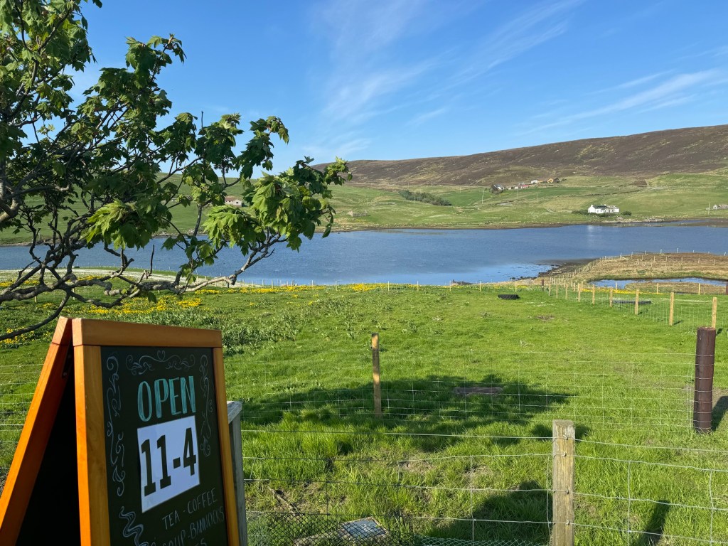 We found our way back to the route and headed to the teahouse. Almost every Unst business, it seems, advertises itself as being the “most northerly.” We even passed by the Most Northerly Kirk. Likewise, Victoria’s Vintage Tea Shop was advertised as the most northerly. And it served the most northerly, and delicious, scones.
