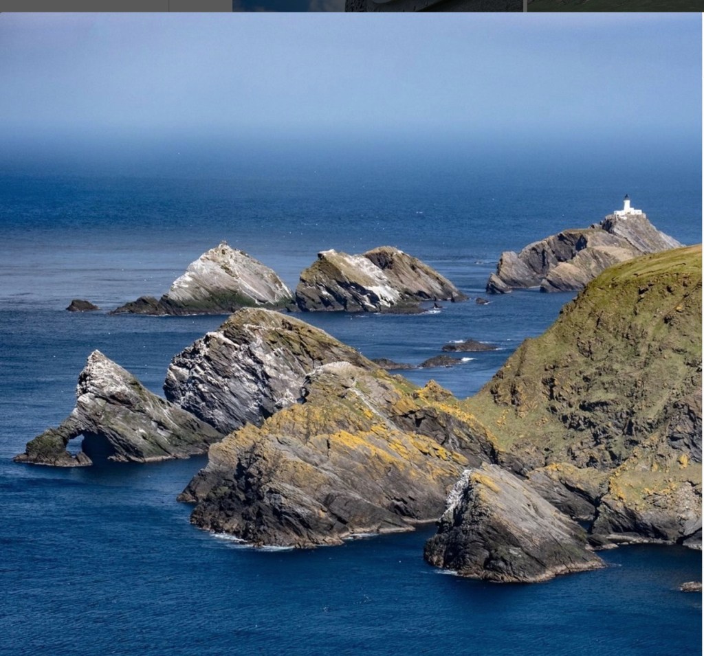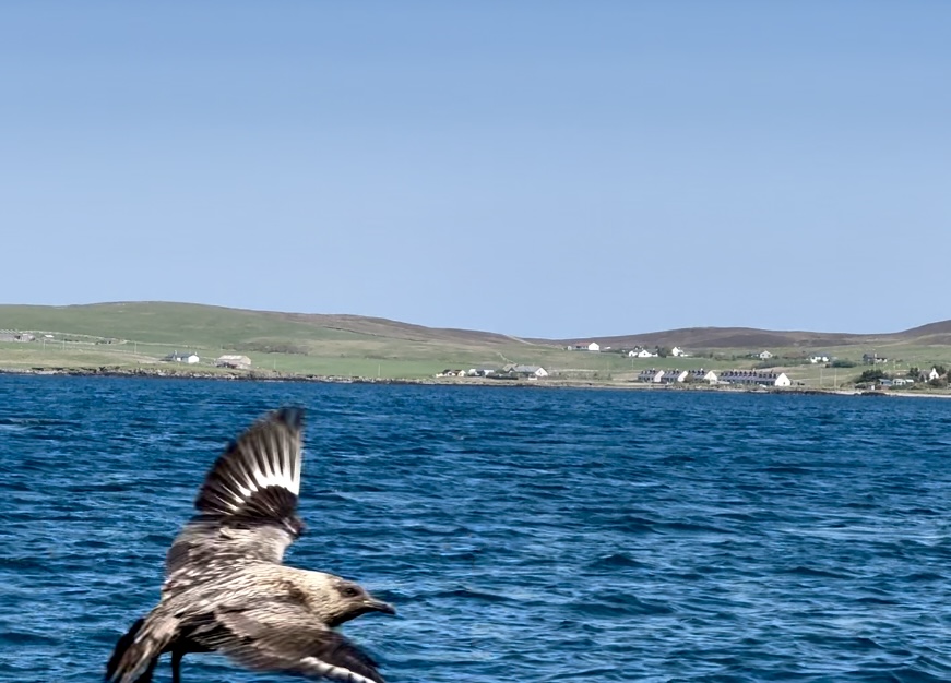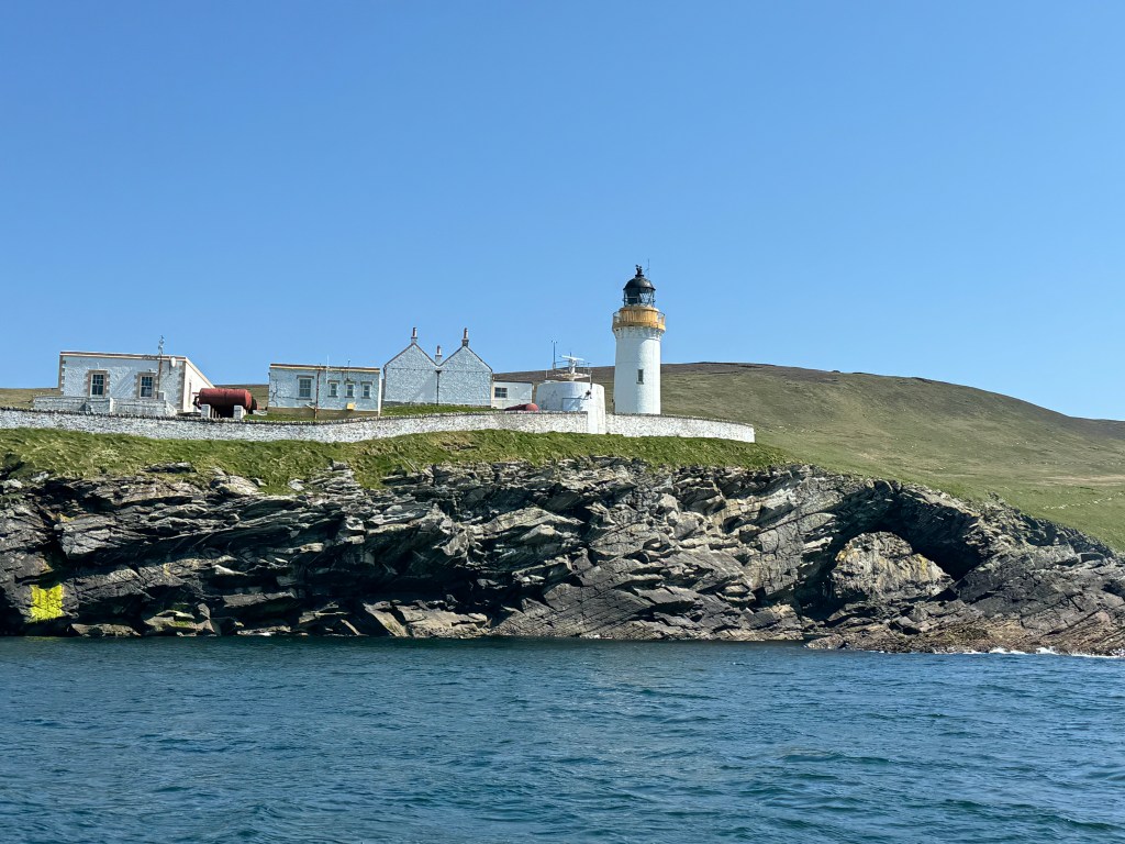 Reluctantly leaving the orcas (who hung around the area for the rest of the day) we sailed around some fabulous cliffs, the Bressay Lighthouse and watched a great skua (called a “bonxie” in Shetland-ese) fend off a gannet for a fish.
