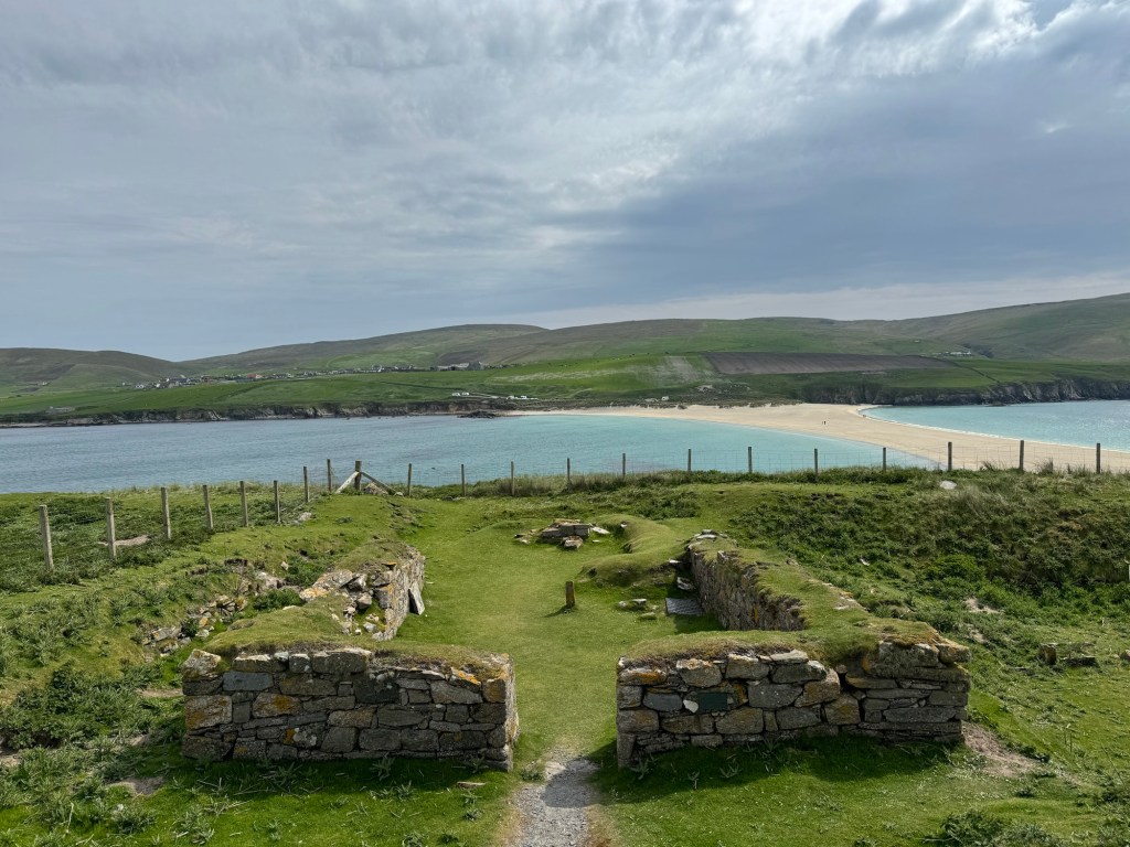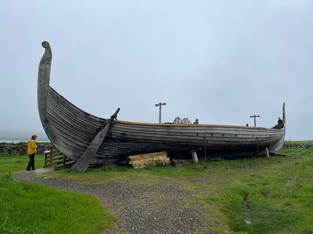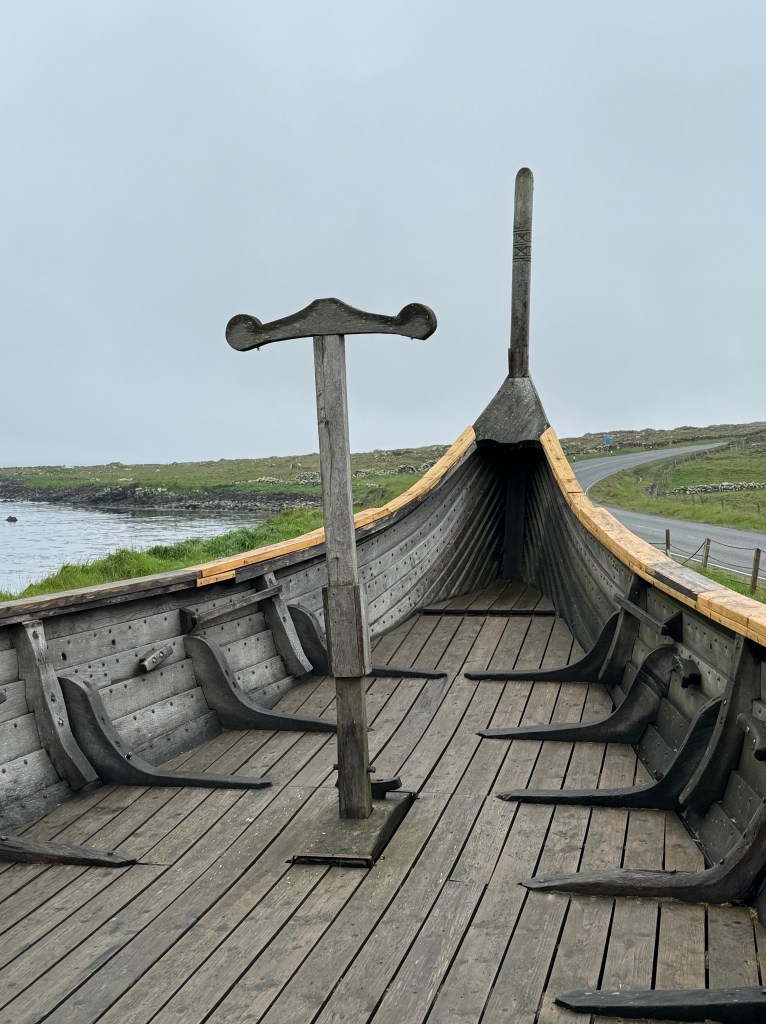 And now a rather violent segue from sweet bus shelters to Vikings, as Unst is one of the richest Viking heritage sites in Europe, with over 60 longhouses uncovered by archeologists so far. At 61 degrees north, the island was the perfect resting spot for Norse travelers on the trading route between Scandinavia, Greenland and Newfoundland. Many settled in this northerly outpost, working the land and making it their home.