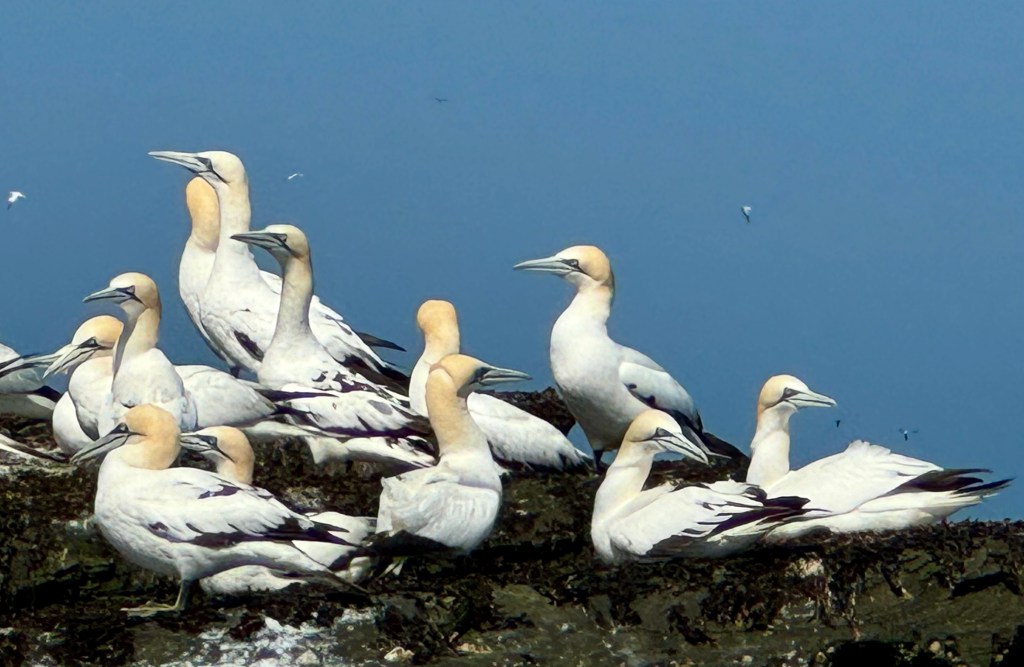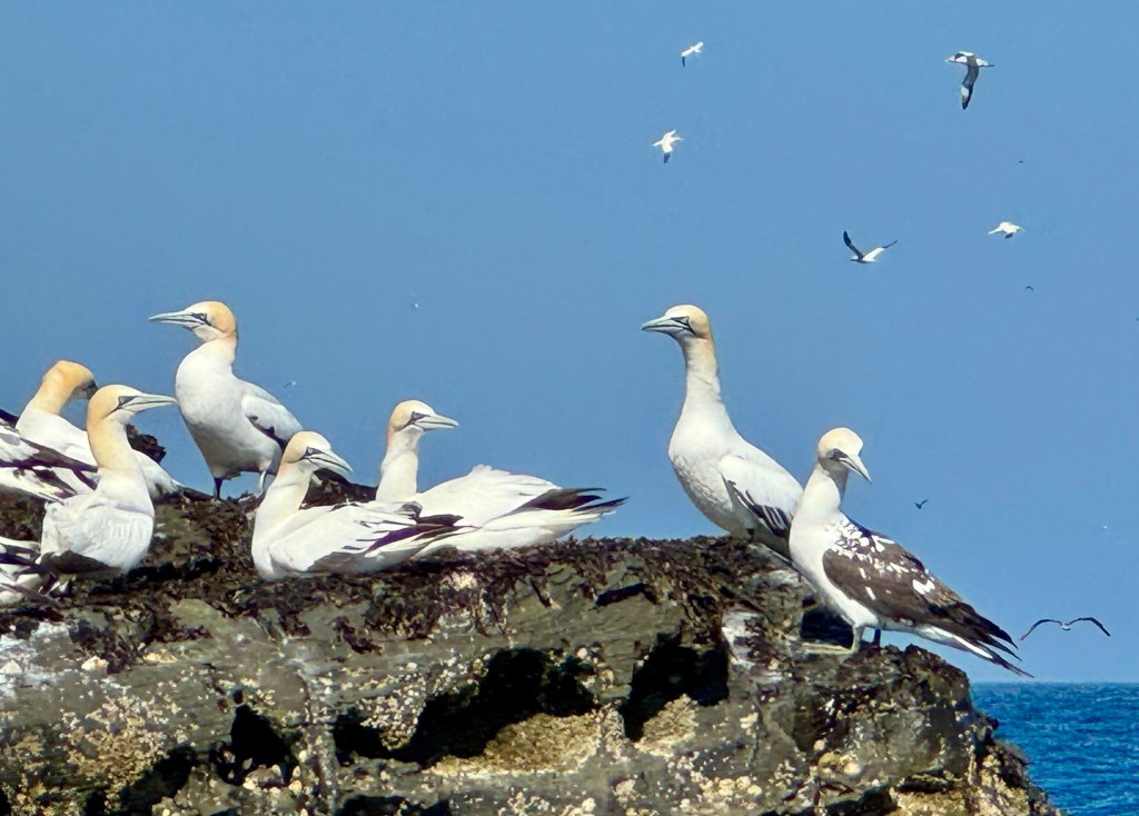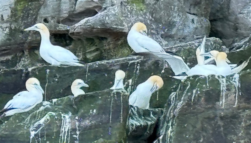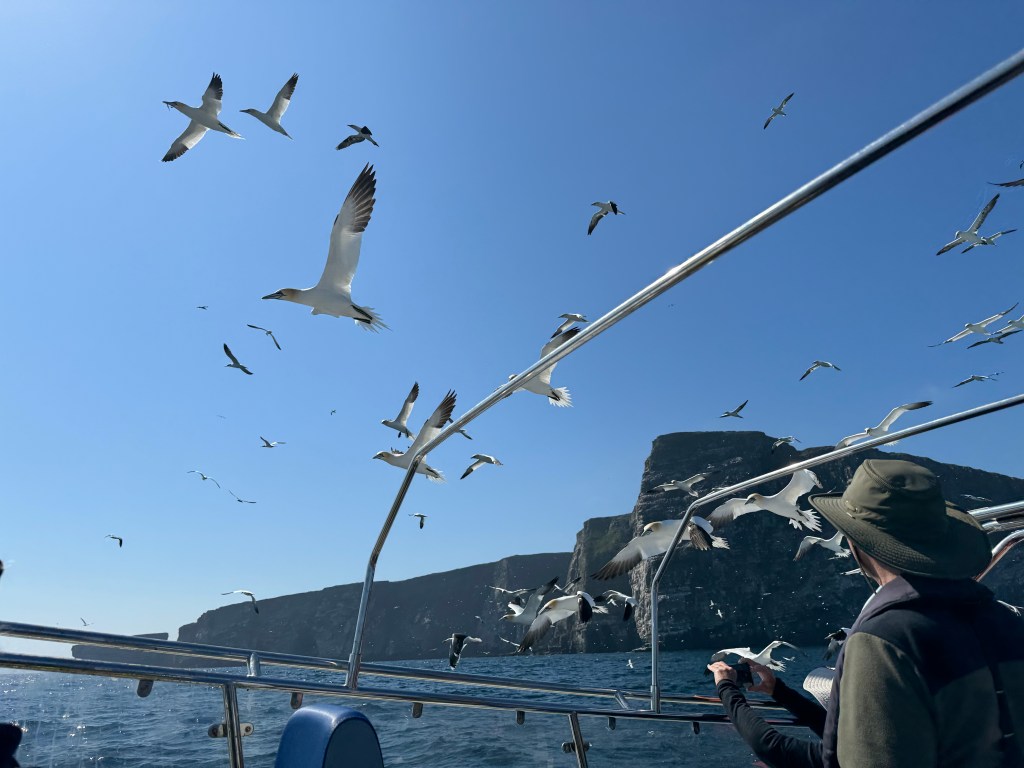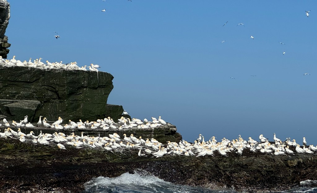 And now for the gannet colony. I’ve honestly never seen anything like it. I mean, 150,000 birds is a lot and they layer the cliff walls, packed in like sardines and yacking at each other having a ball like they are at an outdoor music festival. They are also gorgeous and incredible divers. And once they are submerged underwater, they keep flying while they fish. For a short video narrated by Scottish Obi-Wan Ewan McGregor, check this out: https://www.youtube.com/watch?v=mXXuK9eQVUw&t=9s