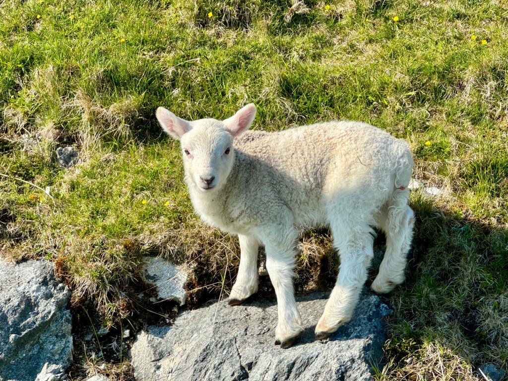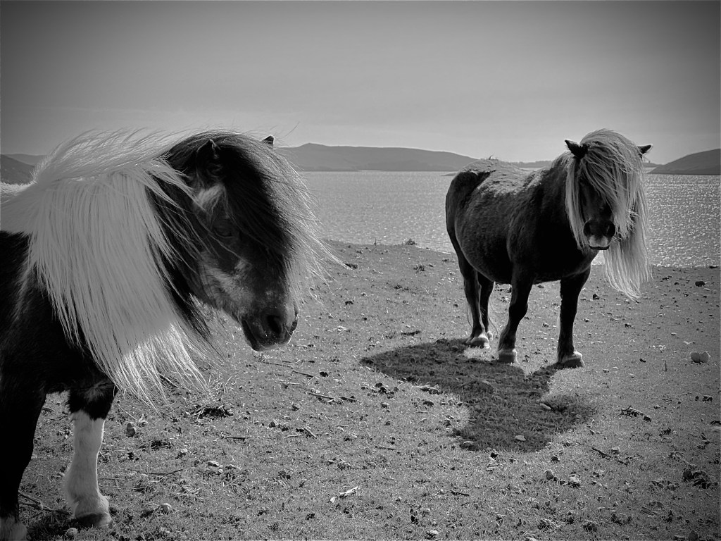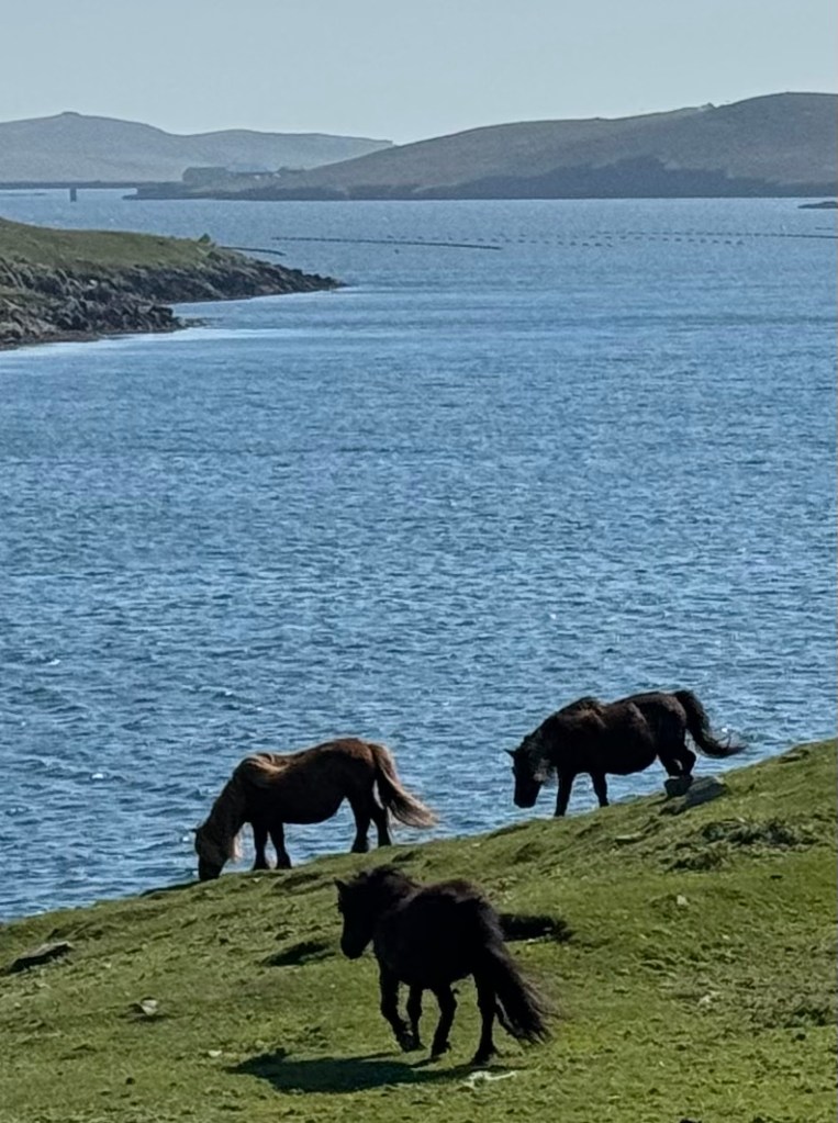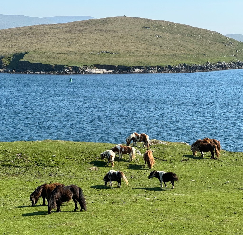 And the day wasn’t even over! We drove west to Scalloway and walked to a lighthouse on a grassy point, passing sheepies and ponies and marveling at the light.